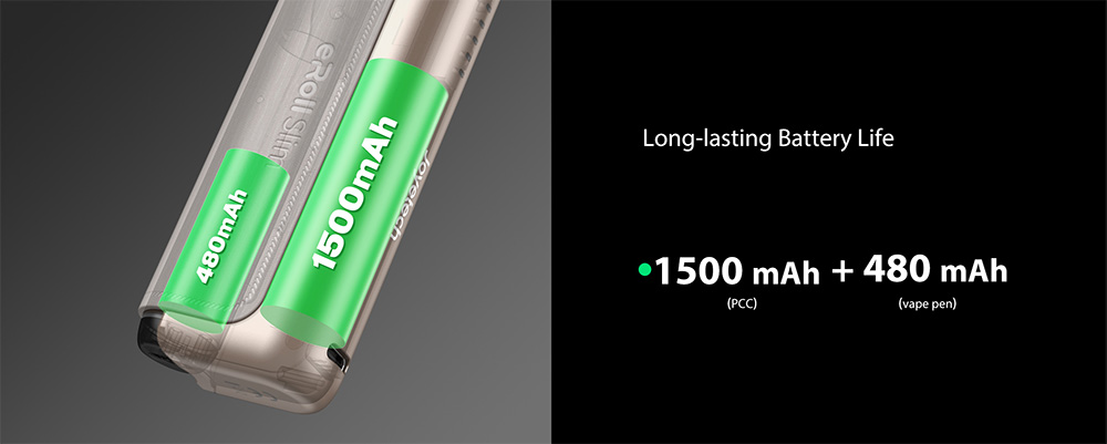 Το eRoll Slim συνδυάζει ενσωματωμένη μπαταρία στο pen 480 mAh με ένα powerbank 1500 mAh, ώστε να έχεις πάντα επιπλέον ενέργεια για φόρτιση εν κινήσει. - Compact & Ergonomic Σχεδιασμός